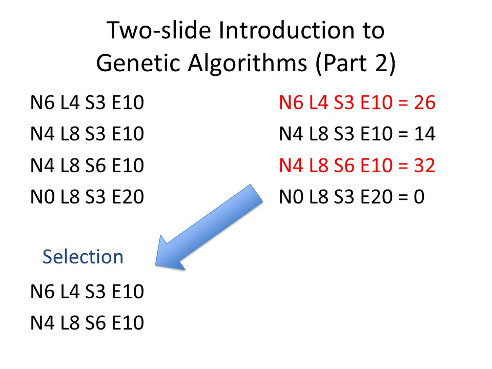 Note, that each genetic algorthm is different. We could try taking the top three finshers. Or maybe there is only one winner. Or another technique is to let all four spiders continue, but make extra copies of the ones that seem to be doing really well.