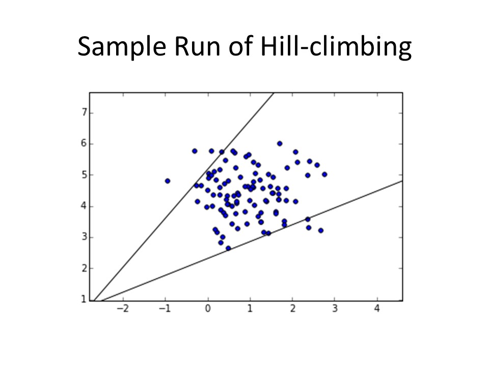 With another round of iterations, a second syntax tree leaf is generated. Which is a fancy way of saying we have two boundary lines for our dataset which optimize the fitness function we created. The procedure of finding more and more tree leaves can be repeated, until a "proper" boundary for the dataset is found. Of course, the number of leaves, and the tightness of the boundary fit is a fitness function itself.