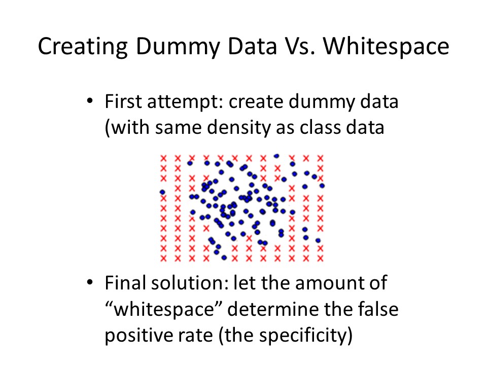 The idea of what "whitespace" is is tough to define. One approach was to seed the data space with a regular grid of datapoints that are "outisde the boundary". This made calculating the fitness function a lot easier, though brough up questions of whitespace density and how to seed the space.